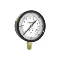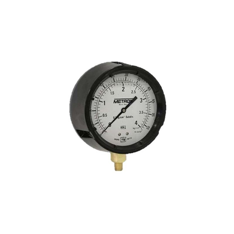 Manómetro Metron de 3 1/2 diámetro de caratula, seco, escala dual rango 7 kg/cm2 ( 0-100 psi ), conexión inferior de 1/4 npt